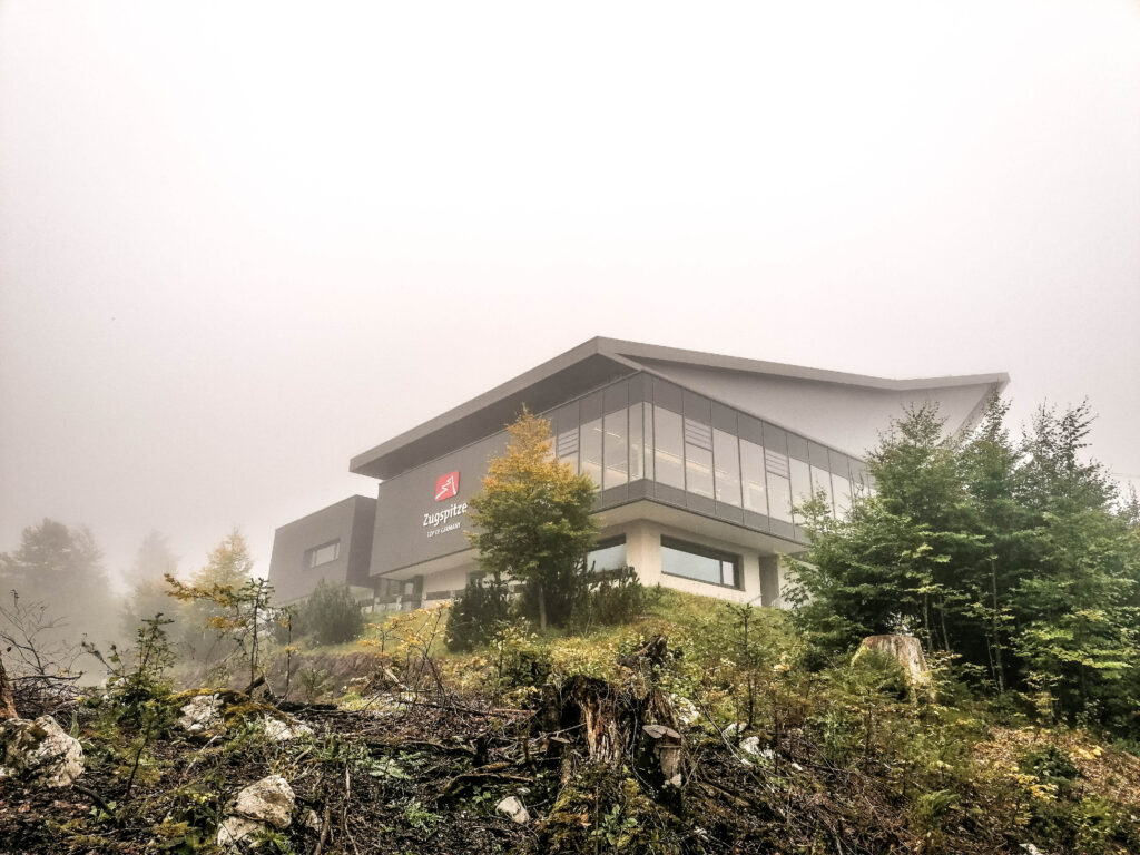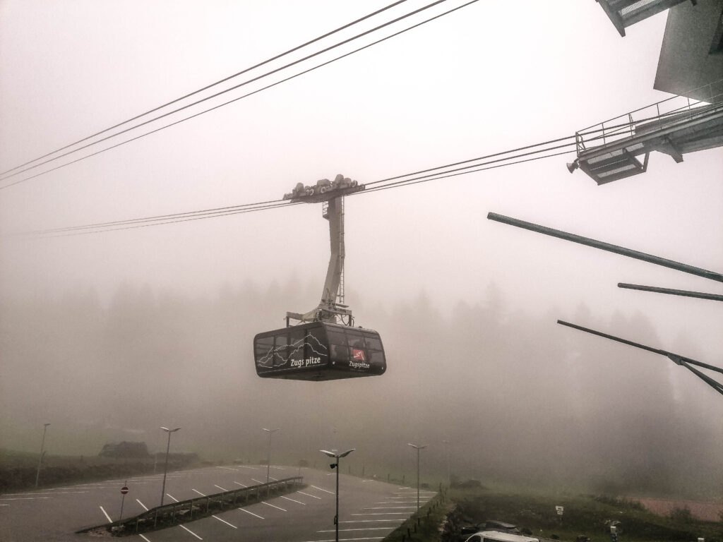 Fast 1 1/2 Stunden dauerte es dann noch, bis wir am Eibsee bei den Parkplätzen eintrafen. Und was hat uns da erwartet? Nebel! So dichter Nebel, dass wir den See nicht einmal sehen konnten. Doch zuerst einmal eingeparkt und ein Parkticket besorgt (9 Euro für 4 Stunden!!). Dann besuchten wir die Talstation der Zugspitz Seilbahn. Ein grandioses Bauwerk mit einigen Weltrekorden. Sie überwindet einen Höhenunterschied von 1945m auf einer Strecke von 4450m. Befördert in der Stunde 580 Personen (120 pro Kabine, mit WLAN, Scheibenheizung, und Panoramaglasboden!) vom Tal auf knapp 1000m Seehöhe bis zur Bergstation auf 2962m Seehöhe. Dabei überwindet sie die hächste Stahlbaustütze der Welt mit 127m Höhe und das längste freie Spannfeld von 3213m Länge! Der Bau kostete in etwa 50 Millionen Euro… Der Preis, wenn wir raufgefahren wären? 69 Euro pro Person (Berg- und Talfahrt) sowie 7 Euro für Nukka. Also in Summe 145 Euro (1995 Schilling für Oldies!)!! NEIN DANKE! Das ist es nicht mehr wert mit einer Seilbahn zu fahren.