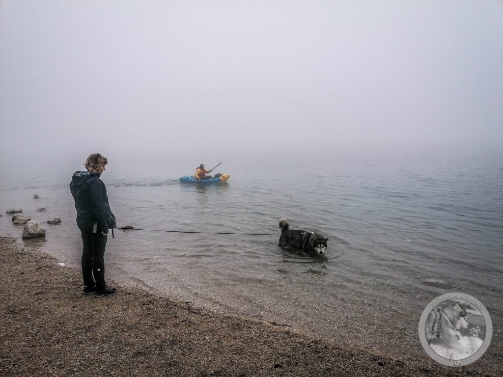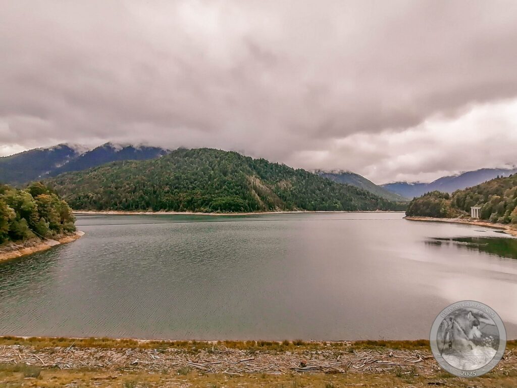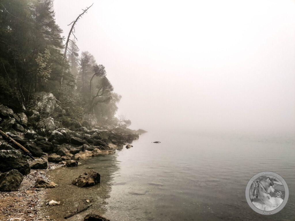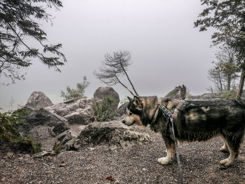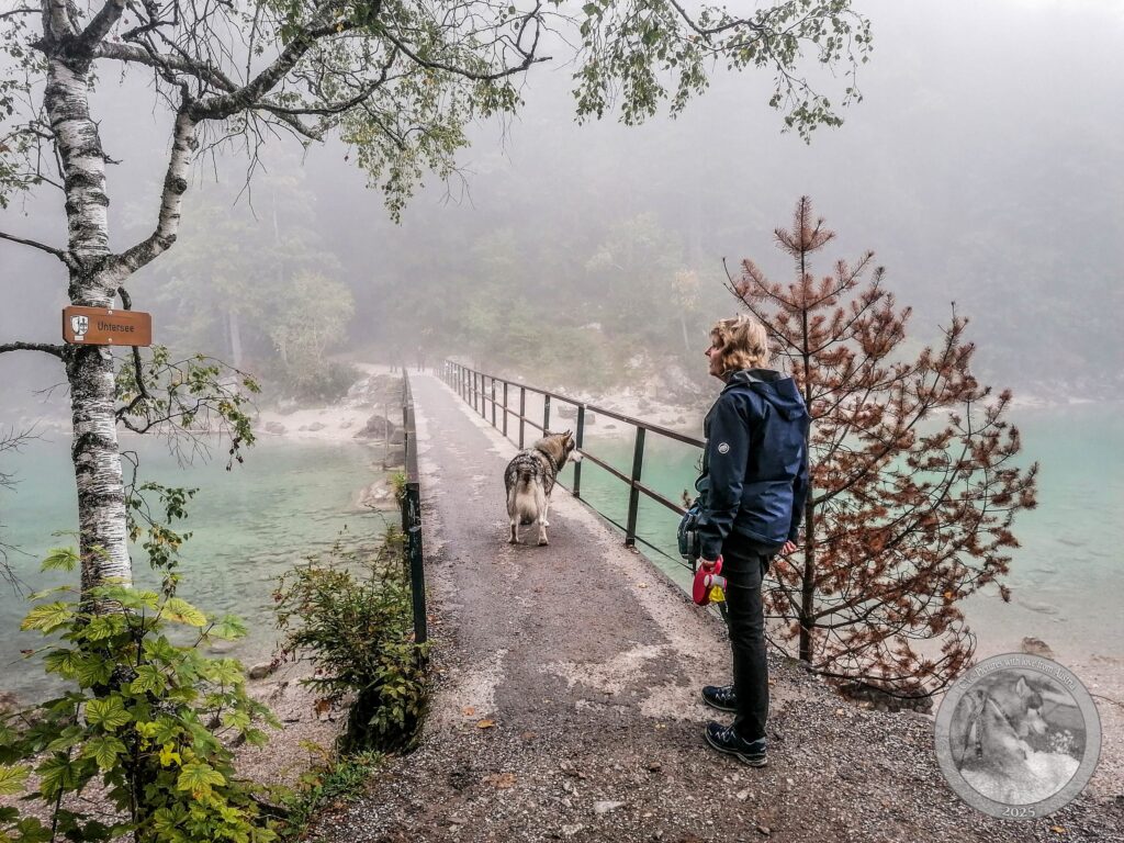 Der Eibsee selbst liegt in etwa auf 973m Seehöhe, ist an seiner tiefsten Stelle 35m tief, und Privatbesitz der Eigentümer des Eibsee Hotels (seit 1884). Entstanden ist er durch einen gewaltigen Bergrutsch vom Massiv der Zugspitze vor ca. 3500 Jahren. Der Rundweg selbst ist ca. 7,5km lang und sollte laut Angaben an den Tafeln ca. 90 Minuten in Anspruch nehmen. Wir brauchten 2 1/2 Stunden weil unsere graue Wasserratte natürlich an jeder nur möglichen Stelle ins Wasser wollte und auch ging. Das Panorana war ……. grau. Nur Nebel, keine Sicht aufs andere Ufer, keine Inseln zum Bewundern, keine Bergsicht. Es blieb die ganze Runde GRAU. Aber der Weg selbst war wirklich schön angelegt, leicht zu gehen, keine wirklich steilen Stellen, und zu dieser Jahreszeit nicht mit tausenden Menschen bevölkert wie im Sommer. Wirklich gut fanden wir die vielen “Müllinseln” wo Mülltonnen bereit standen. So konnte es für niemanden eine Ausrede geben, seinen Dreck nicht entsorgen zu können (und ihn wo zu hinterlassen, speziell Hundehaufen). Auch nett war die Tatsache dass uns fast jeder der uns entgegen kam, wie es ab 1000m Seehöhe so üblich ist, grüßte! Dazu komme ich aber später noch einmal zurück. Wie erwähnt, Nukka nutzte die Runde total aus und badete trotz der niedrigen Temperaturen von Wasser uns Luft ausgiebig. Mit einem absolut sauberen “Hündchen” kamen wir dann vor 13:30 Uhr zurück zum Parkplatz. Wir entschieden uns nicht hier in der Gegend was essen zu gehen, sondern in unser gebuchtes Hotel zu fahren. Das Landgasthaus Sonnenhof in Klais. Die Fahrt vom Eibsee zum Sonnenhof dauerte keine halbe Stunde. Somit war es kein Problem nach der langen Anfahrt vom Morgen und der Seenrundwanderung.