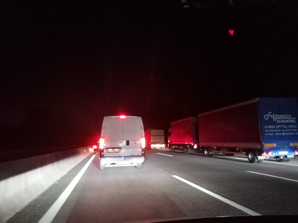 Am Mittwoch war es dann so weit. Um 3 Uhr früh läutete der Wecker. Raus aus den Federn, fertigmachen, Auto beladen, mit Nukka Gassi gehen, denn um 4 war die Abfahrt in Richtung Deutschland geplant. Laut Google-Maps sollten wir zwischen 5 Stunden & 10 Minuten und 7 Stunden & 40 Minuten für die Strecke brauchen. Was für eine Angabe … Immerhin 518 Kilometer. Mein Plan war möglichst früh weg zu fahren, um den Berufsverkehr nicht voll zu erwischen. Und so gings um 3:45 Uhr schon los. 15 Minuten früher als geplant. Von uns aus über die A22, die S5 und die S33 nach St. Pölten, dann weiter über die A1 in Richtung Salzburg. In Allhaming Nord machten wir um knapp 6 Uhr die erste Rast wegen Nukka. Kaum 15 Minuten, und schon waren wir wieder auf der Autobahn. Und dann gleich nach der Auffahrt: Totaler Stopp wegen einer Totalsperre. Ein Fahrzeugbrand. Als die Meldung im Radio und am Navi kam, standen wir schon mitten drin im Stau. Und gleich zur Anmerkung: Eine Rettungsgasse wurde zwar gebildet, aber viele Vollhonks dachten sich dann, super die machen Platz für uns, und fuhren skrupellos nach vor. Dann war sie blockiert und hinten kamen die Einsatzwägen. Mehr braucht man wohl dazu nicht mehr zu sagen.