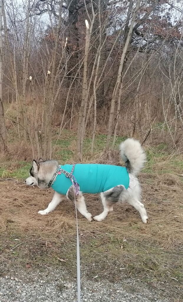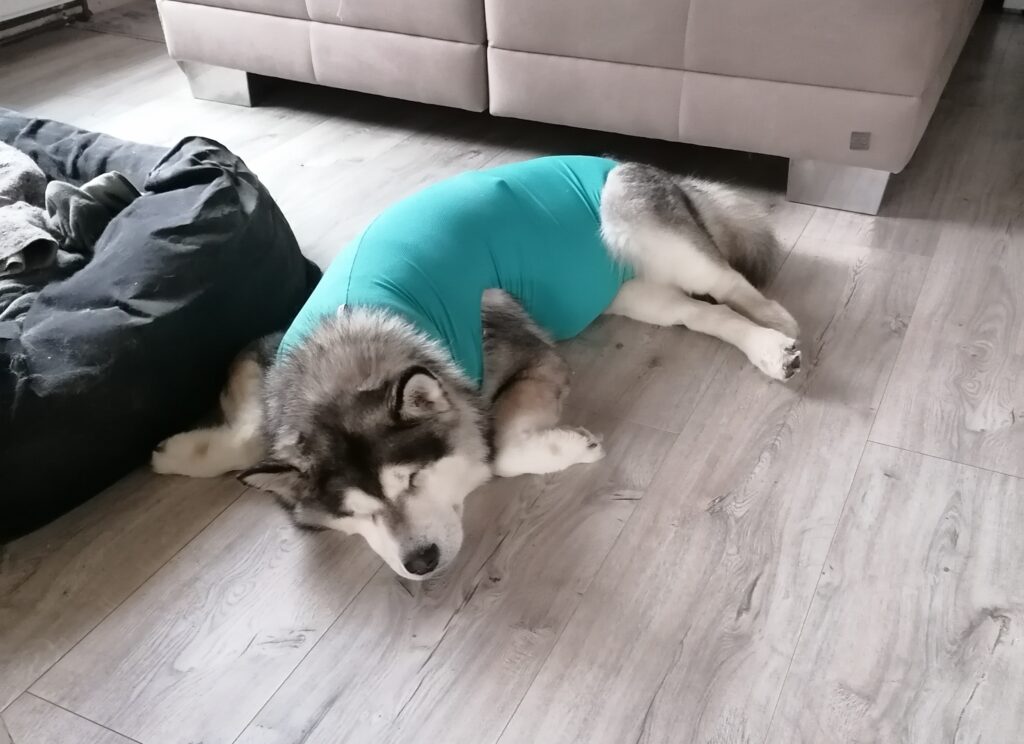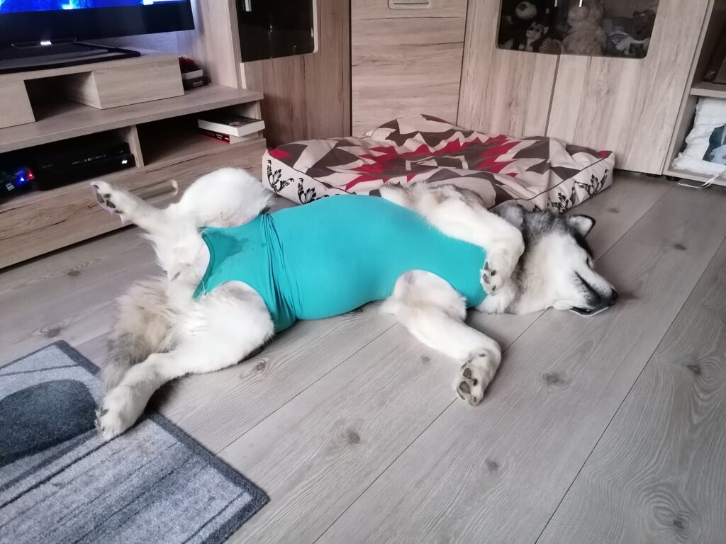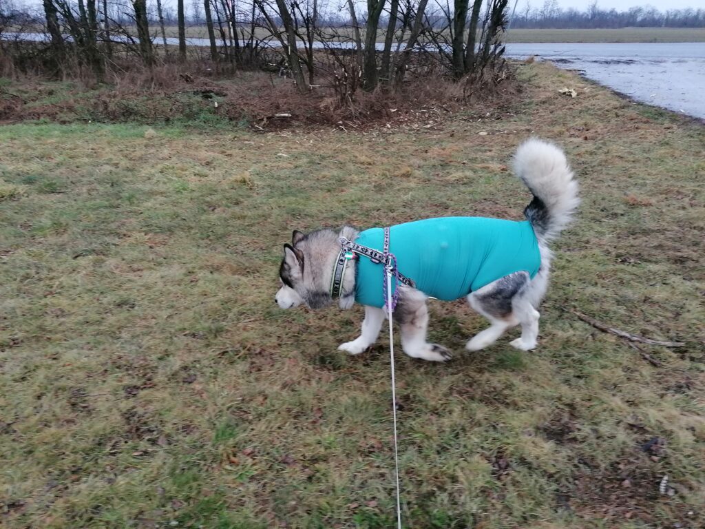 8 Uhr morgens … Nukka schlief noch tief und fest, musste dann aber mit Frauchen raus auf die Gassiwiese. Ihr Body ist heute Morgen trocken gewesen. Also keine Wundsekretion, oder die Lücke hat sich irgendwie verklebt und ist zu. Sieht man so halt nicht wenn sie angezogen ist. Wir lassen sie auch in Ruhe damit. Genaue Kontrolle gibts wieder am Abend.