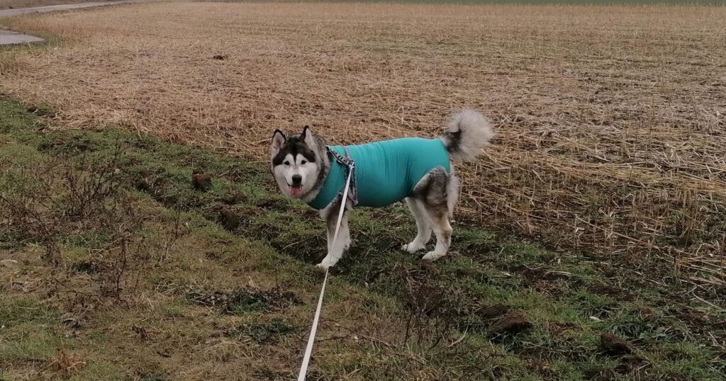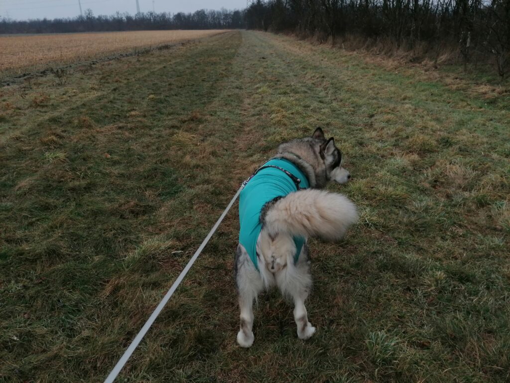 Ein halbes Monat ist schon wieder seit der OP um. Die Zeit läuft und läuft. Kurzer Blick “unter den Hund”, ihr Body ist nur ganz leicht feucht. Die Stelle wird aber immer kleiner. Wir sind also weiterhin am richtigen Weg. Das Inflacam (Metacam) haben wir nun von 50 auf 30 (kg) reduziert, das Antibiotika gibts weiterhin morgens und abends. Jetzt gehts erstmal raus auf die Gassiwiese.