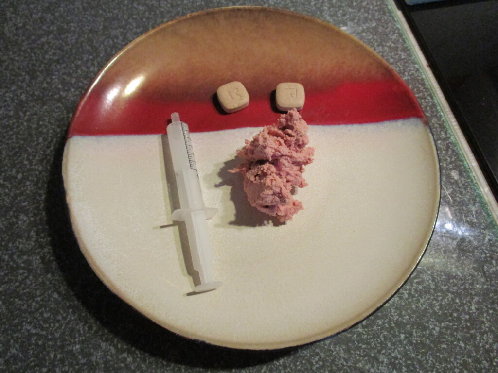 Nukkas tägliches Frühstück. Entzündungshemmer, Schmerzmittel, und pulverisiertes Antibiotika … versteckt in der Leberpastete. Am Abend kriegt sie nur das Antibiotika in der Pastete.
