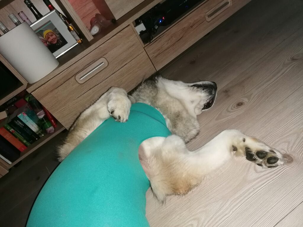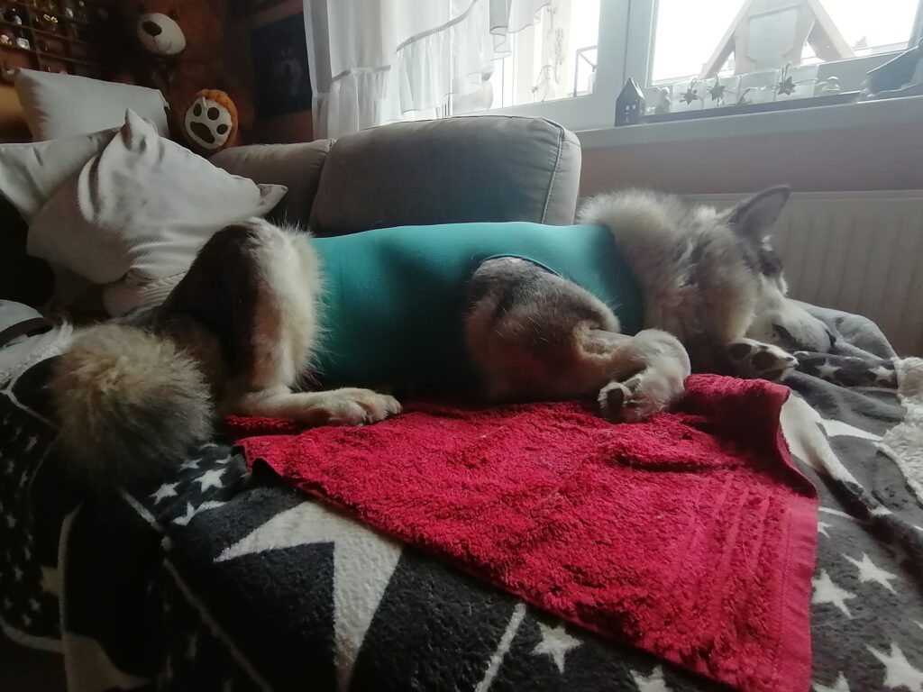 Die Wundversorgung gestaltete sich heute Abend ein wenig schwierig. Nukka lässt sich nicht mehr gerne ausziehen und knurrt wie ein Riese. Auch das seitliche Hinlegen klappt erst nach einigen Anläufen. Sie ist halt stur, aber ich denke nicht dass wir ihr dabei weh tun. Denn kaum auf der Seite liegend, und von mir versorgt sowie von Frauchen gekrault … schnarcht sie.