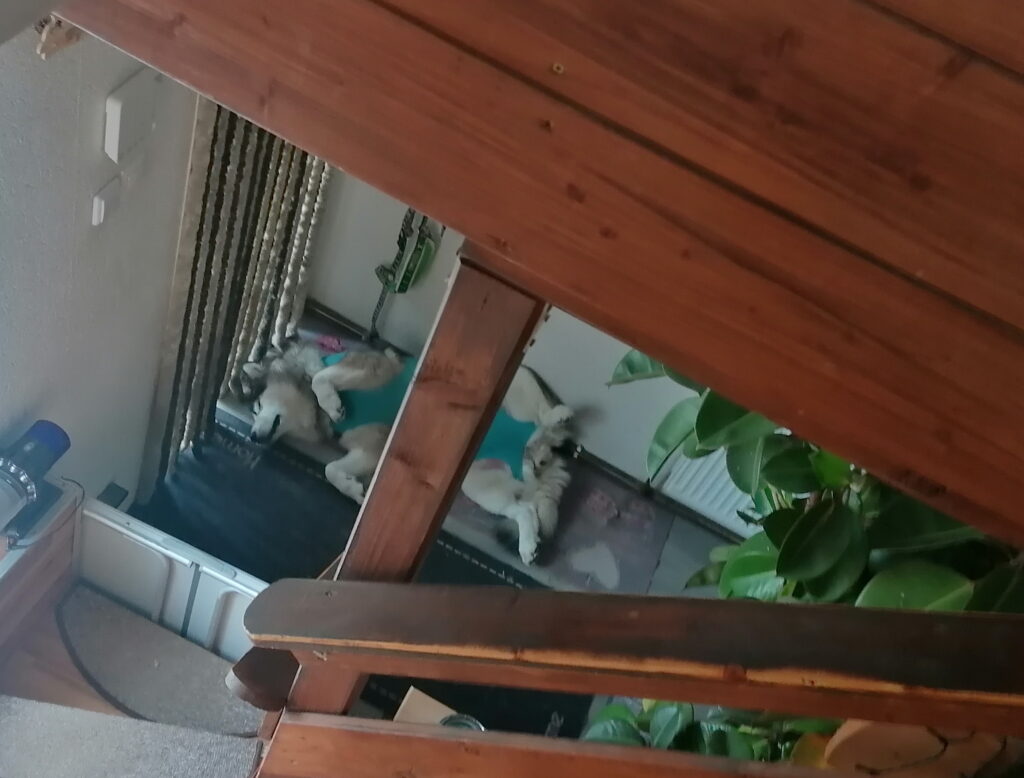 Am 4. Tag nach dem Eingriff ist Nukka gut drauf. Jetzt schläft sie noch. Das ist gut. Schlaf fördert die Heilung. Heute Nacht bin ich zweimal auf, weil ich dachte sie leckt an ihren Wunden am Bauch, doch es war nur die berüchtigte Hinterpfote. Das macht sie seit Welpe wenn ihr fad ist oder was nicht nach ihren Wünschen läuft. Also Alarmmodus wieder ausgeschaltet … *lach*