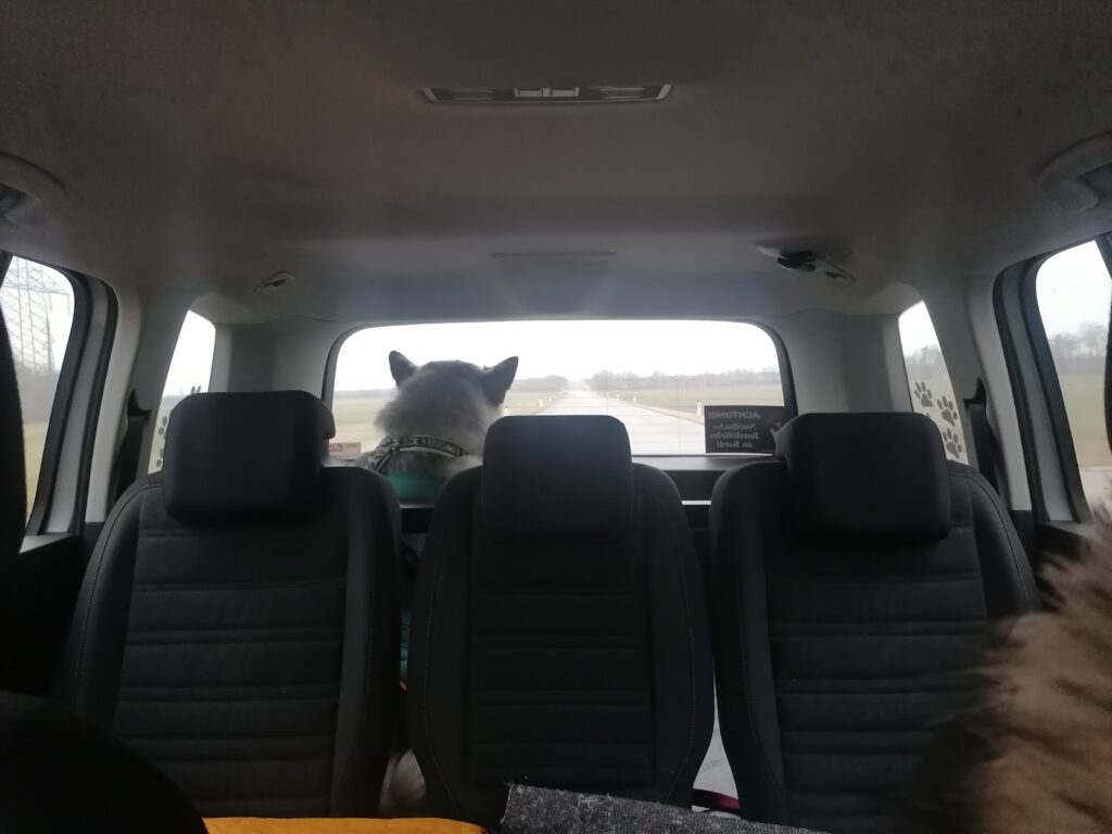 Derzeit haben wir ja keine Hundebox im Wagen, um sie leichter ein- und aussteigen lassen zu können. Auch wenn sie plötzlich Hilfe brauchen würde, kommt man so einfacher ra. Natürlich ist sie mittels einer Leine gesichert, und sie kann nicht so einfach rausspringen, wenn die Heckklappe geöffnet wird. Sie ist aber wirklich sowas von brav.