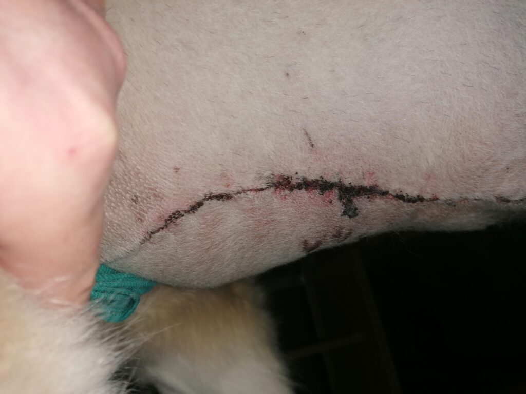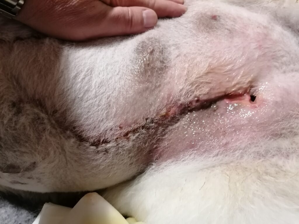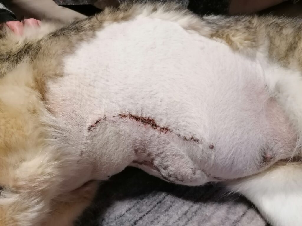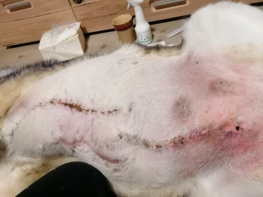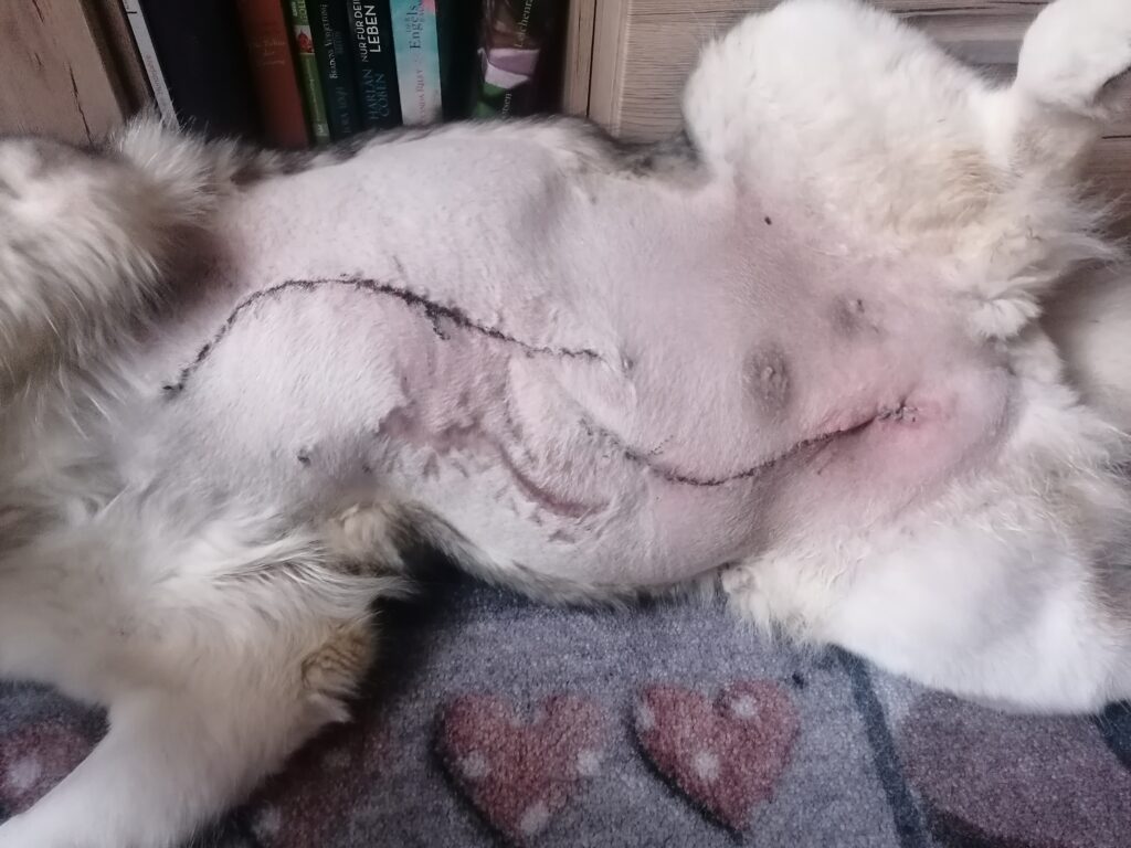 Das ist die vordere Wunde. Super schön vernäht und heilt auch gut. Alles trocken. Da saß der riesige Tumor. Nukka hat nun vorne beidseitig keine Milchleisten mehr. Bauchseitig nur mehr links die halbe, rechts ebenfalls keine mehr.
