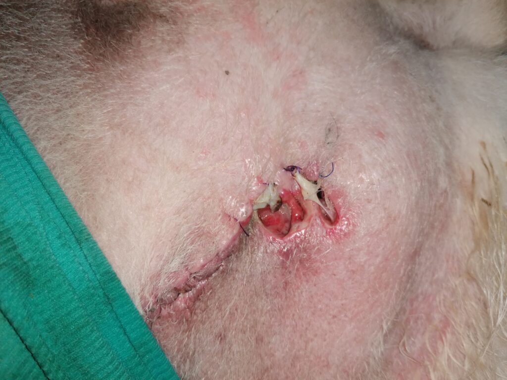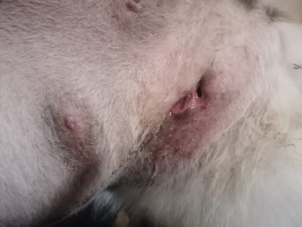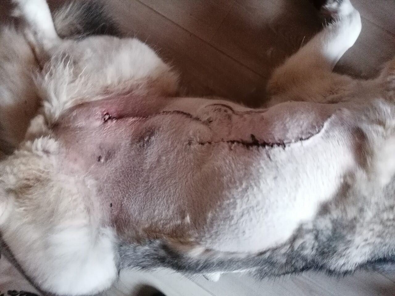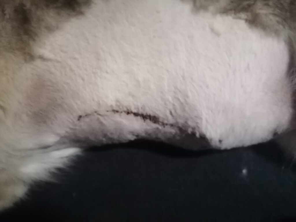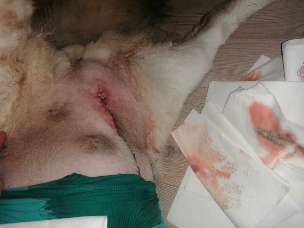 Das ist die vordere Wunde. Super schön vernäht und heilt auch gut. Alles trocken. Da saß der riesige Tumor. Nukka hat nun vorne beidseitig keine Milchleisten mehr. Bauchseitig nur mehr links die halbe, rechts ebenfalls keine mehr.