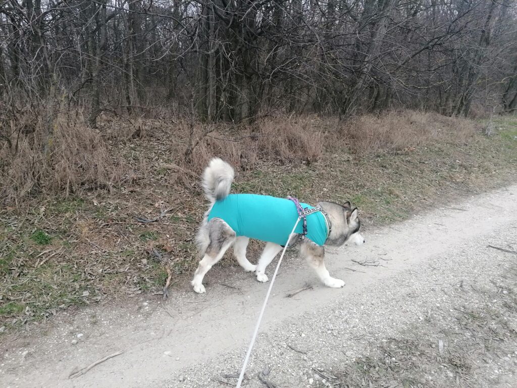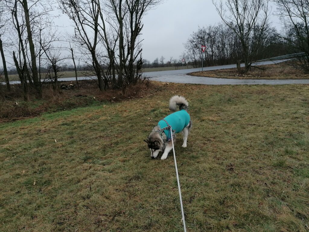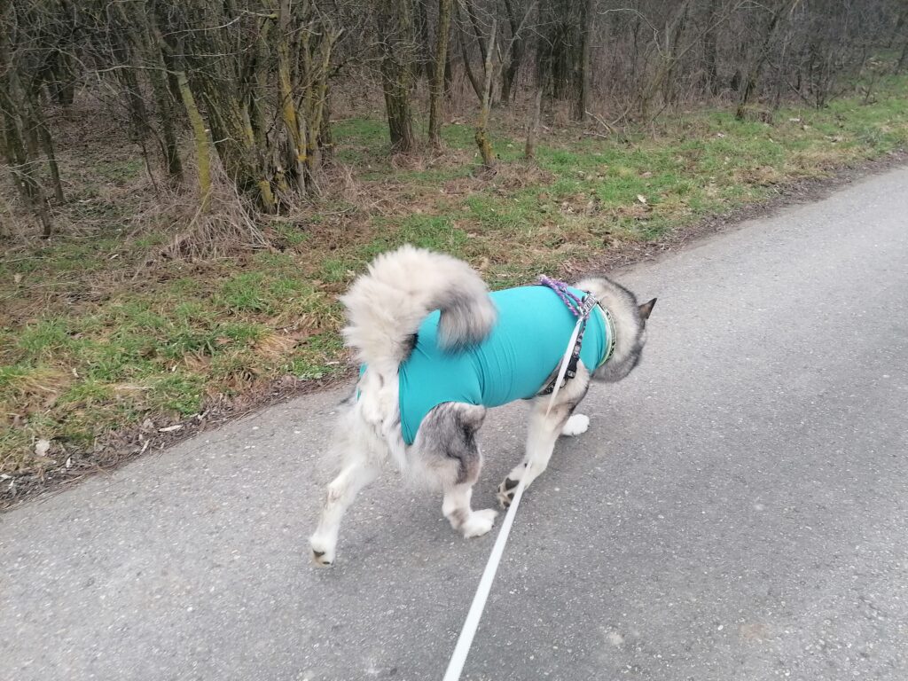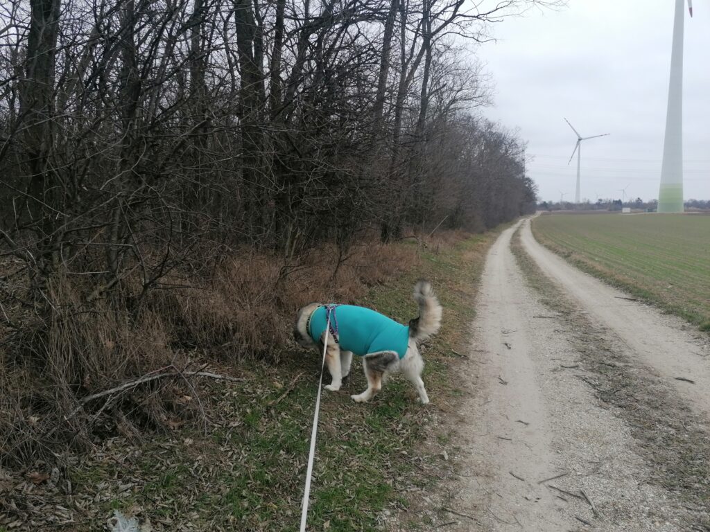 Vormittag sind wir ein kleine Gassirunde bei uns draußen auf der Wiese gegangen. Dann fuhren wir weg. Sie muss raus, was sehen, was erleben. Sonst wird sie echt unrund. Also fuhren wir nach Gerasdorf zur Post um den Amazon-Body zurückzuschicken. Das Teil ist so nicht schlecht, aber die von VETMEDCARE sind einfach besser. Das Stretchmaterial legt sich super am Körper an und schützt die Wunden damit viel besser. Nach der Post sind wir daher nochmal in die Tierklinik Korneuburg (da sind diese Teile Lagerware) gefahren und haben einen zweiten dieser Bodys geholt. Dann haben wir was zum Wechseln. Anschließend gings noch kurz in den Wald, wo sie ihr “Geschäft” erledigen konnte und dann nach Hause. Riesen Kaustangerl als Belohung fürs brav sein inklusive.