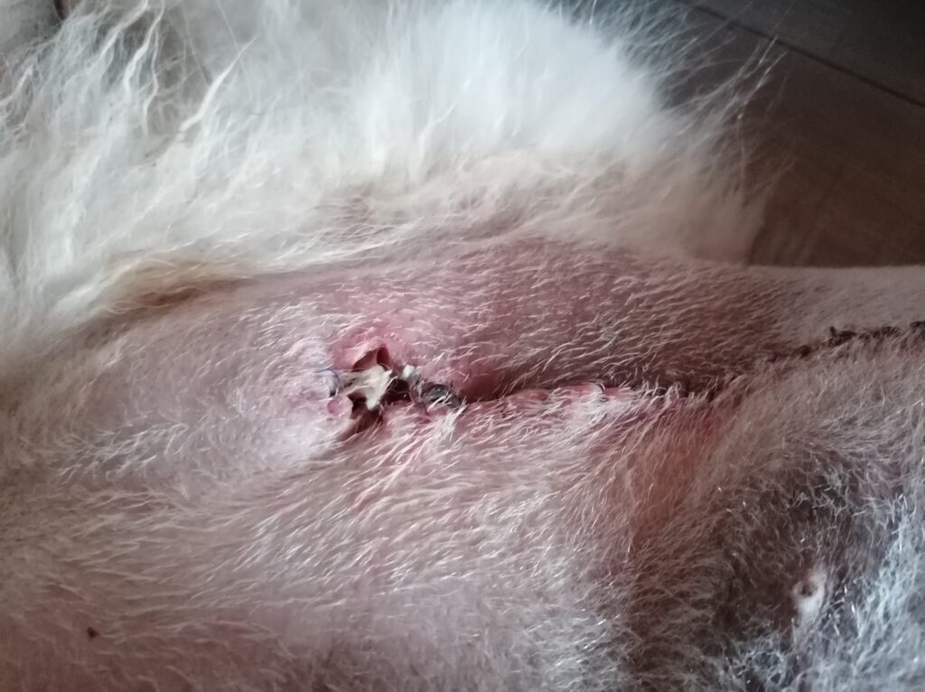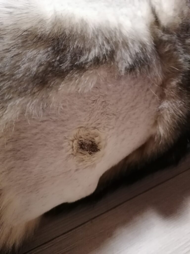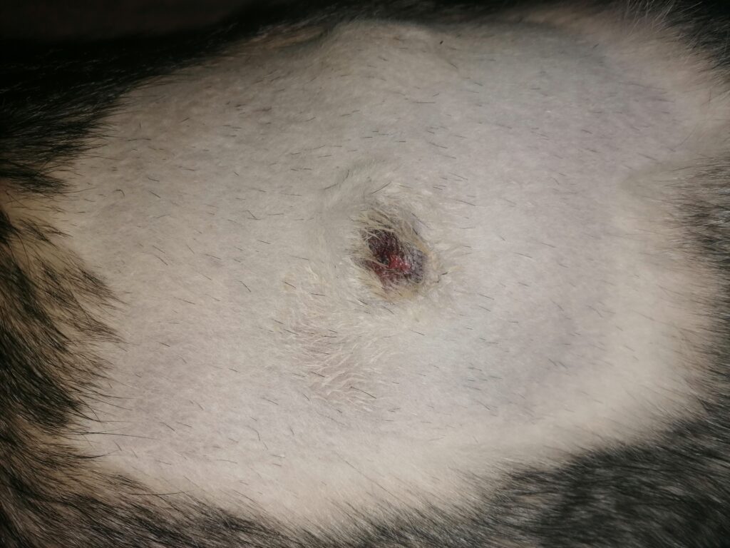 Die Wundkontrolle nach dem Gassigang war nicht positiv. Es hat sich ein richtig großes Loch gebildet, und abgestorbenes Gewebe hing am Rand herum. Ich habe zu unserer Haustierärztin Kontakt aufgenommen und durfte mit Nukka hinfahren.
